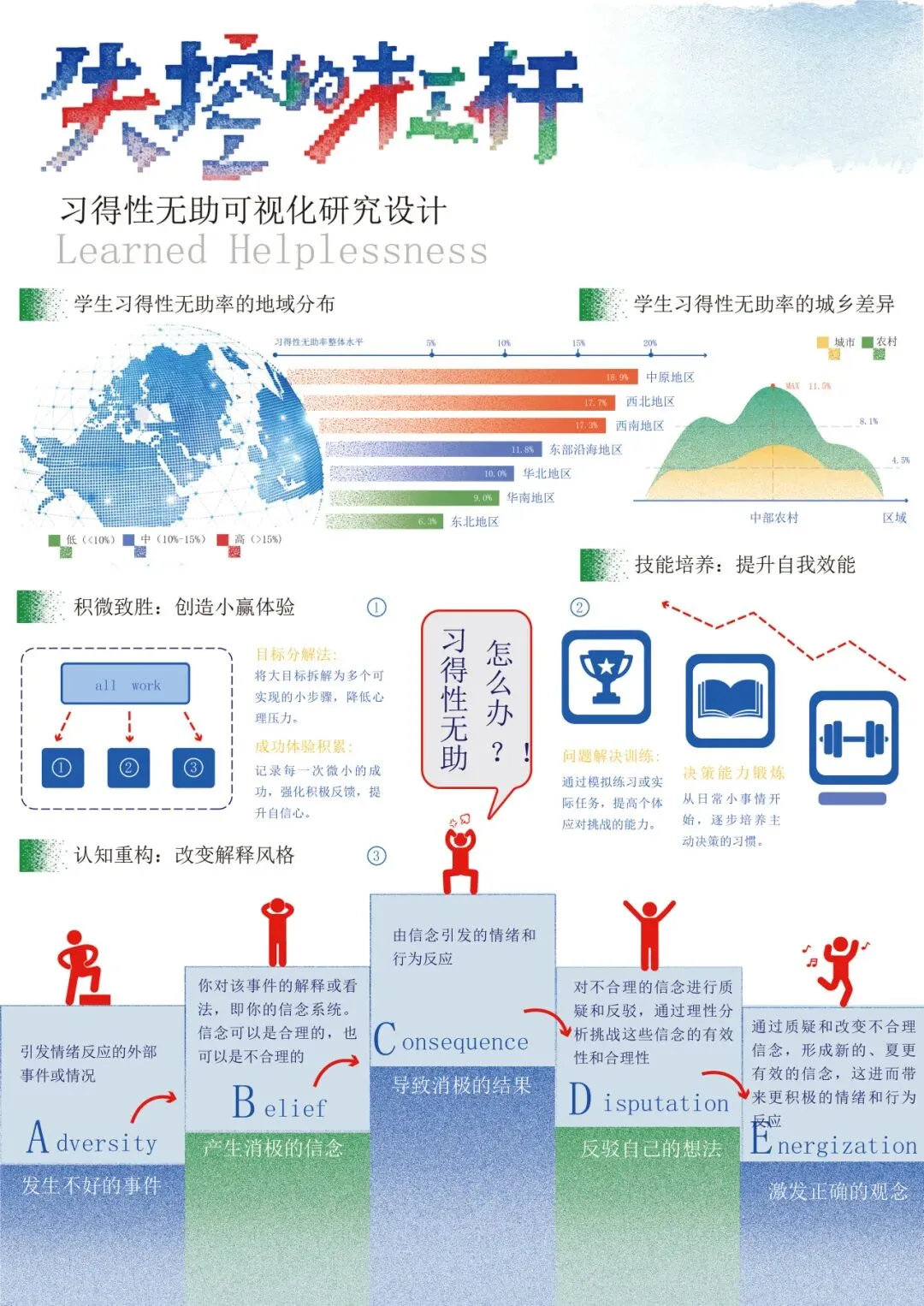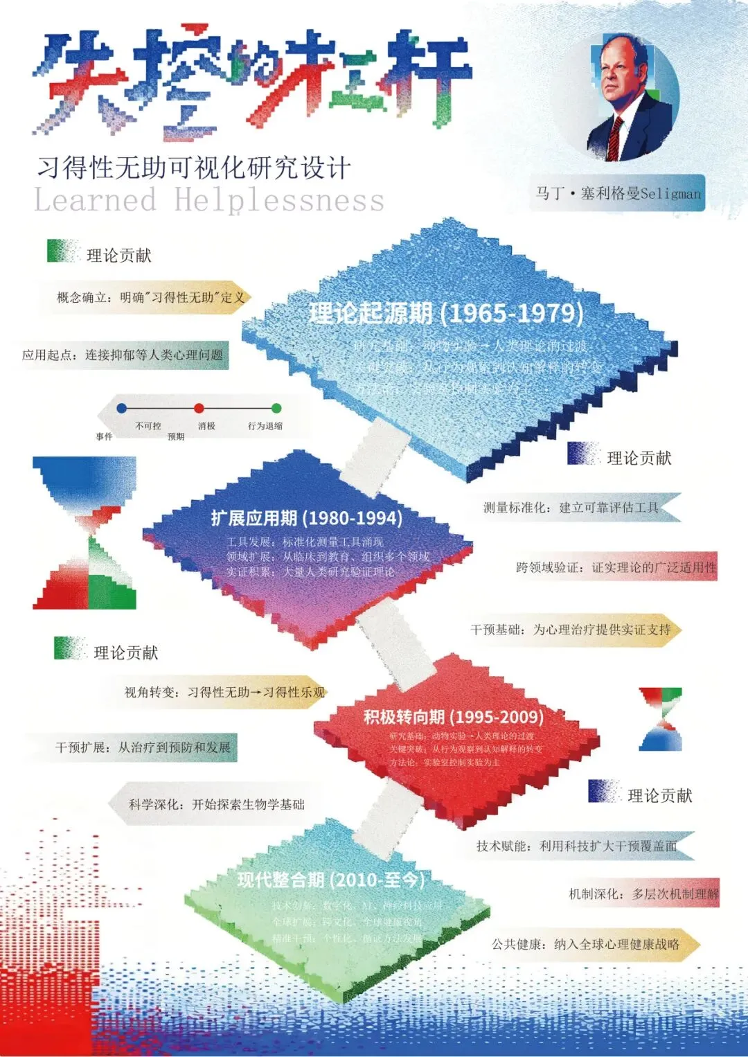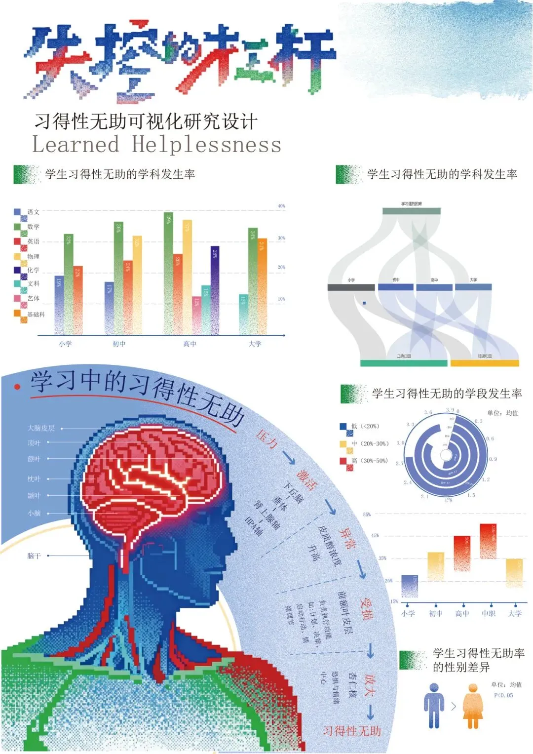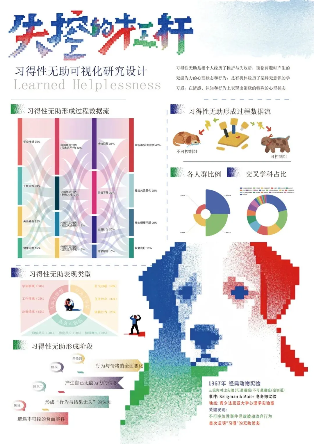 本设计聚焦“习得性无助理论”的演变、实验过程、内涵、发展阶段、表现类型与各人群学科占比展开信息可视化设计。设计旨在通过像素的模块化、数据化特性,将复杂的心理学理论转化为可被精确解析与动态重组的视觉系统,从而在冰冷的科技美感中,传递出关于人类认知脆弱性与可塑性的深刻思考。