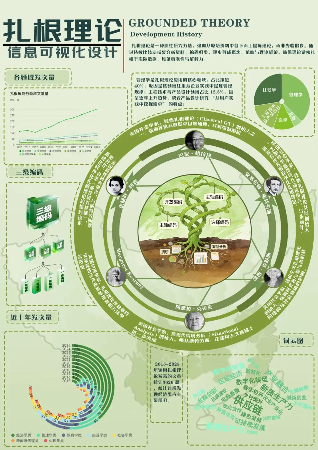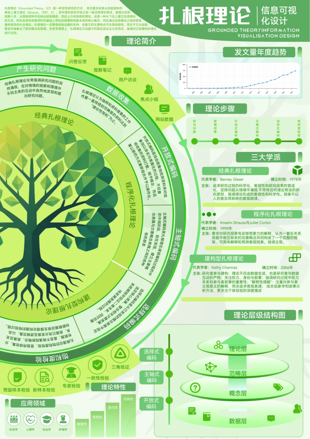 本次设计主题围绕 “扎根理论”信息可视化,采用具象植物形态、绿色为基调,将其抽象学术信息转化为直观视觉载体,平衡专业性与可读性。