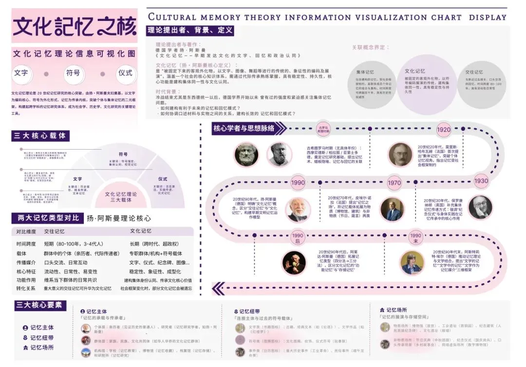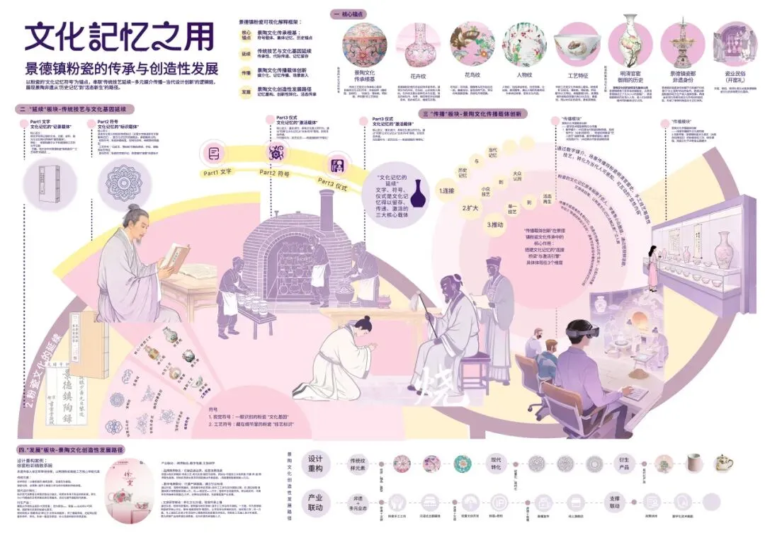 本次可视化设计以“文化记忆之核”与“文化记忆之用”为主题,展开分为两张视觉图表的设计:第一张聚焦文化记忆理论内涵、理论框架(文化记忆之核),第二张则以景德镇粉瓷为案例,展示文化记忆理论在传统工艺传承中的应用具体展开分析(文化记忆之用),形成“理论解构-实践落地”的完整研究视角。
