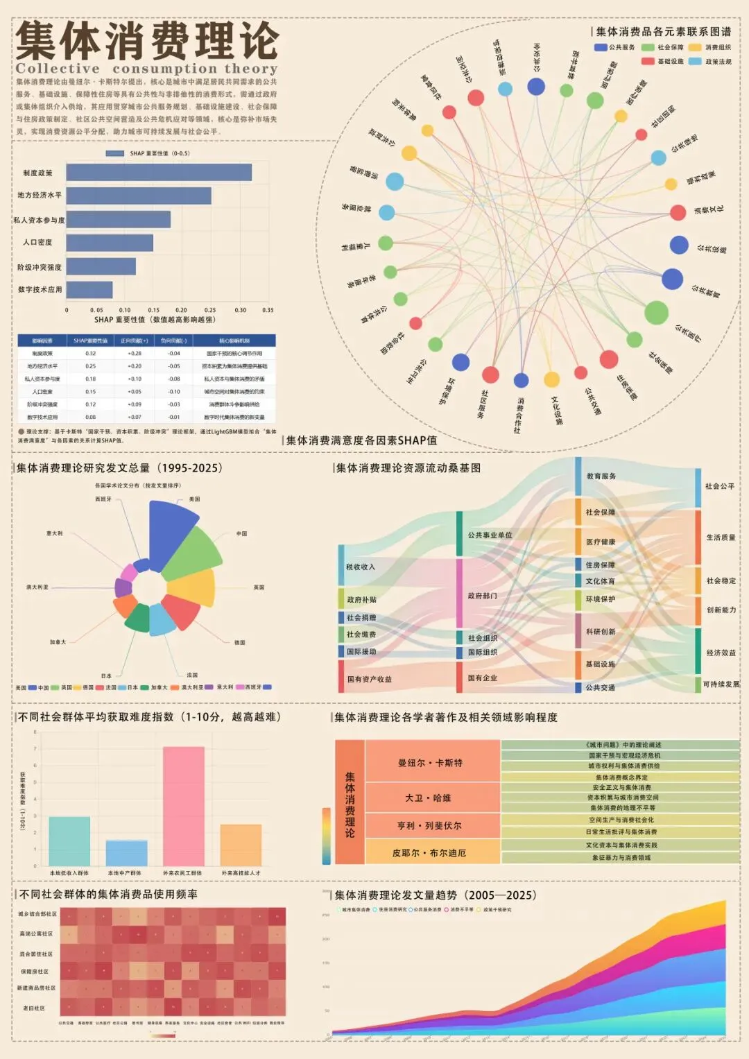 本次设计将 “集体消费理论”进行可视化解构,聚焦集体消费的群体差异、跨群体关联与结构特征,助力观者快速理解该理论的框架与现实运用。