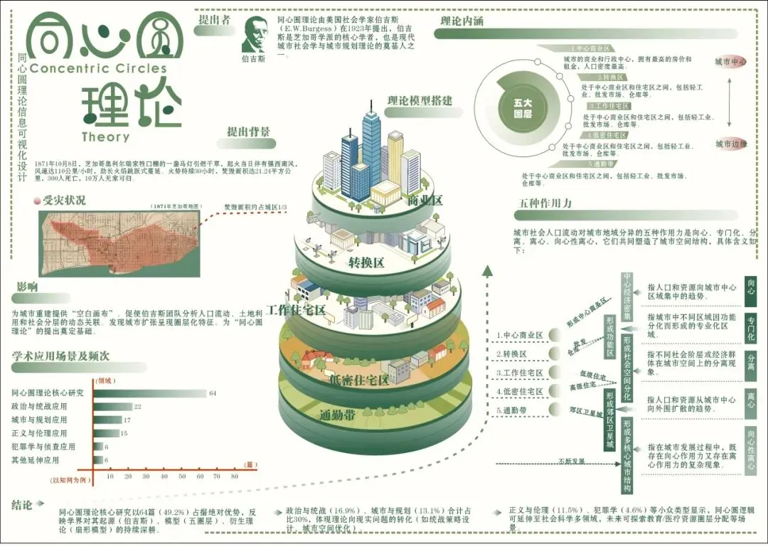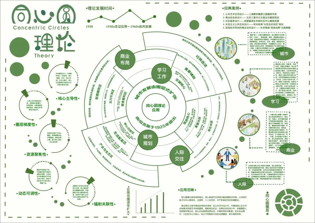 本作品以同心圆理论的多维应用与价值阐释为设计主题,聚焦伯吉斯1925年提出的同心圆理论,通过信息可视化形式,将抽象的圈层发展逻辑转化为直观视觉语言,展现理论从学术概念到城市规划、商业空间布局、人际交互空间等领域的落地应用。