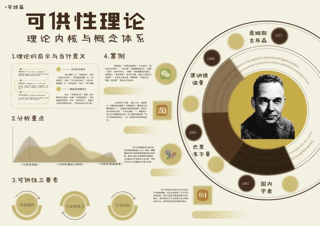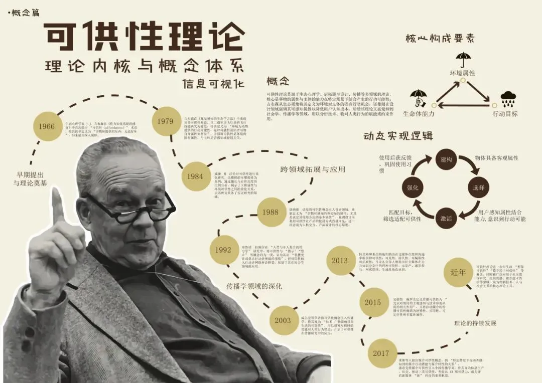 本次设计以吉布森肖像为素材,结合该理论发展历程中的重要时间节点串联演进事件,借雨伞等符号具象化核心要素;思路采用“时间轴 + 模块分区”结构,左侧环形时间线呈现1966年至今的理论发展,右侧分模块展示核心要素、实现逻辑与跨域应用,兼顾信息的时间流动与逻辑分类;用色以暖米色作底营造舒适阅读感,暖橙色突出时间节点,深棕搭配符号区分模块层次,整体色调统一。