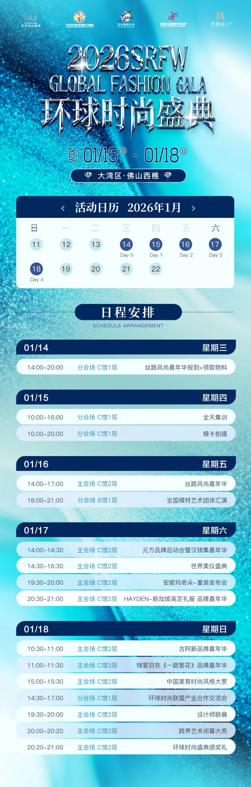 丝绸之路国际时装周·环球时尚盛典暨首届西樵时尚周将于1月15日至18日,在西樵山会展中心启幕。活动期间,11个各具特色的时尚品牌将带来创意走秀,环球时尚联盟产业合作交流会将促成跨国资源对接。详情:南海西樵