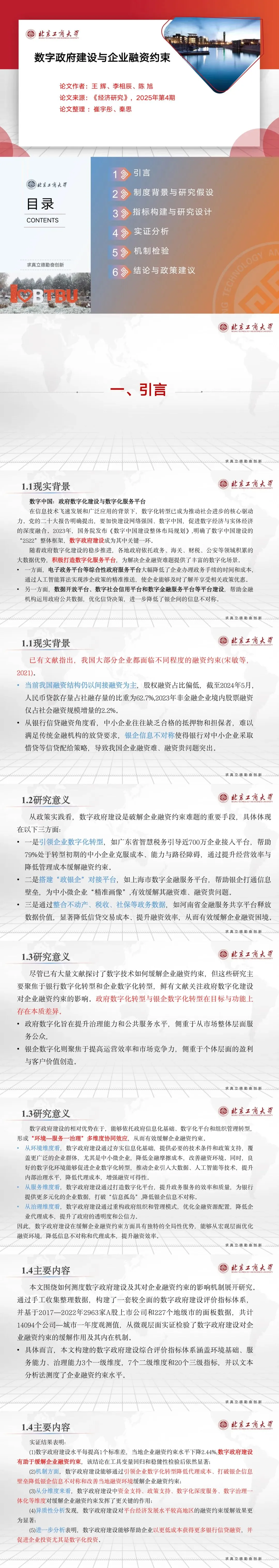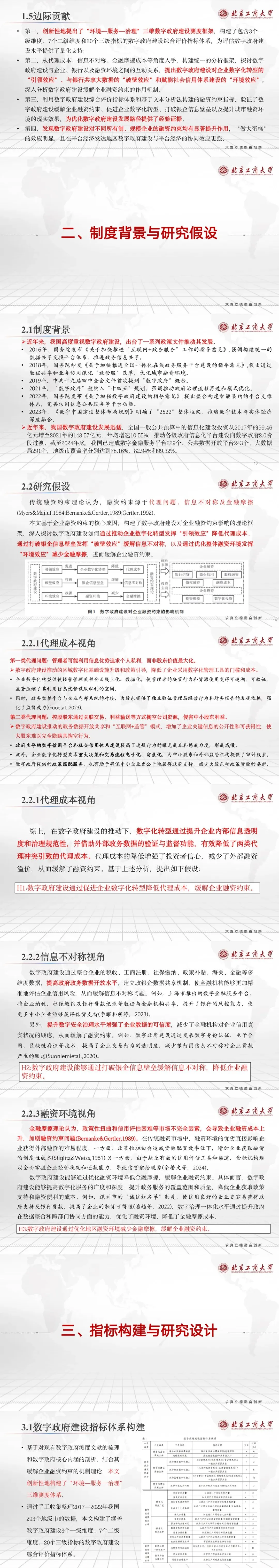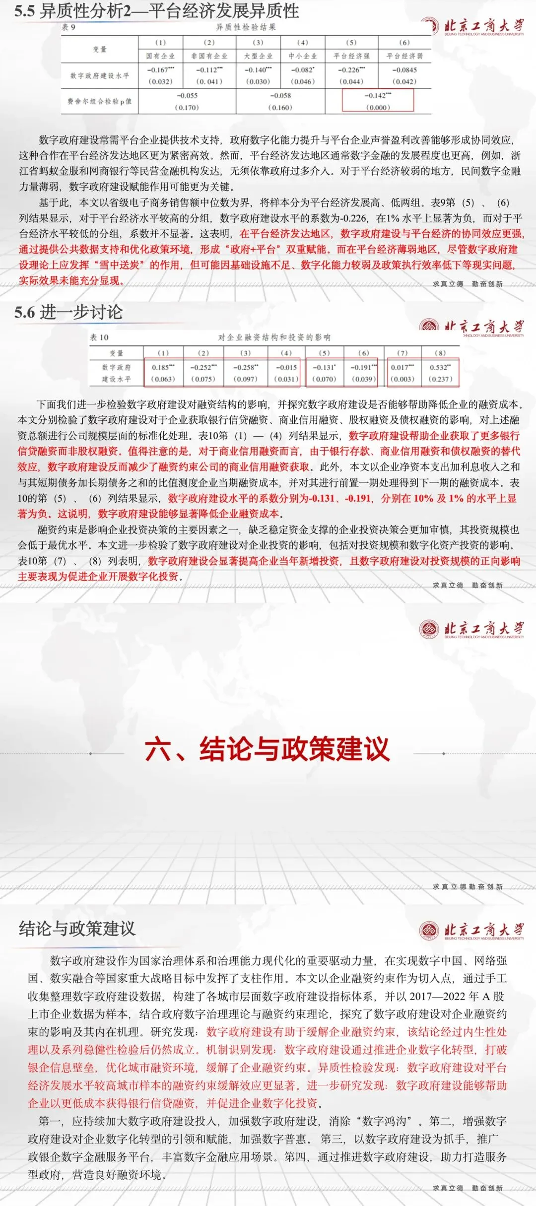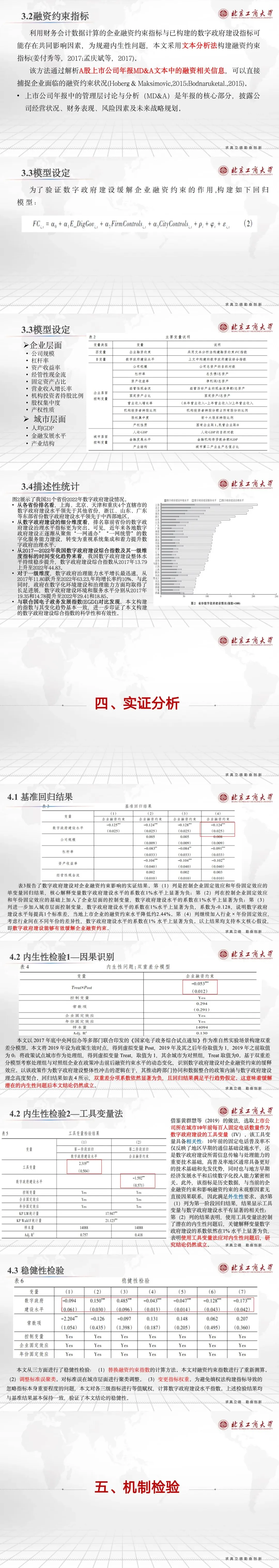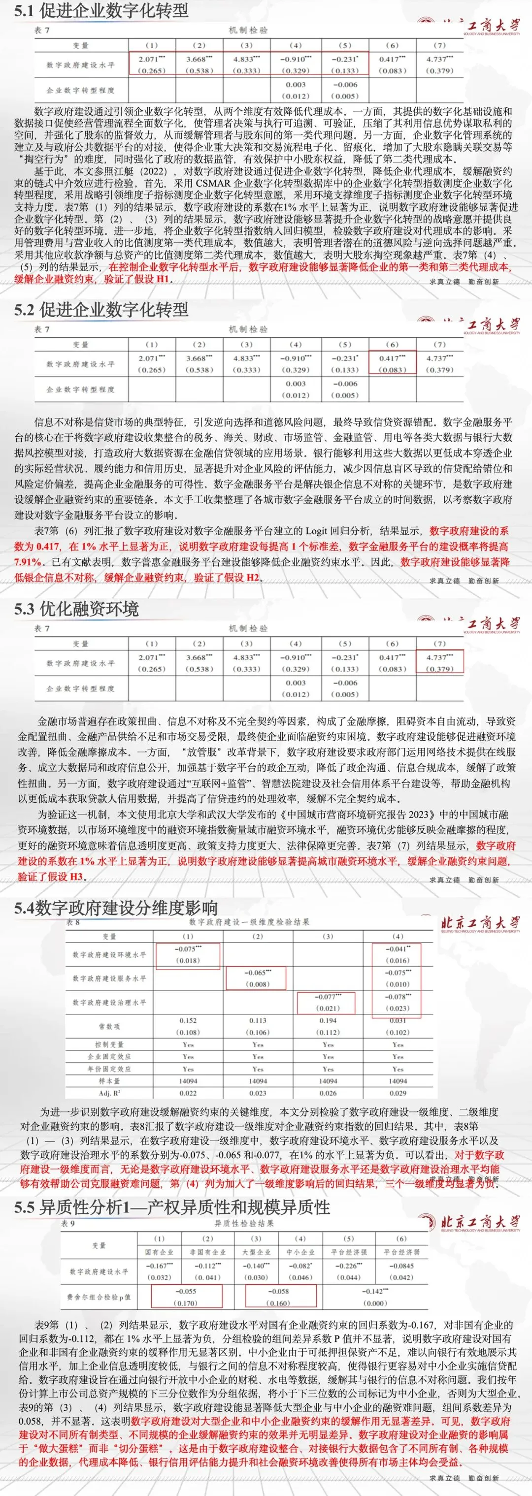 (5)进一步分析表明,数字政府建设能够帮助企业以更低成本获得更多银行信贷融资,并促进企业投资尤其是数字化投资。