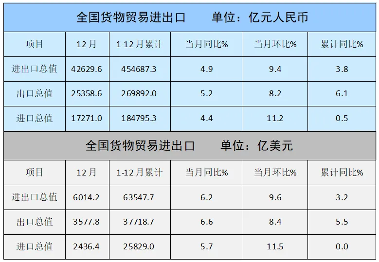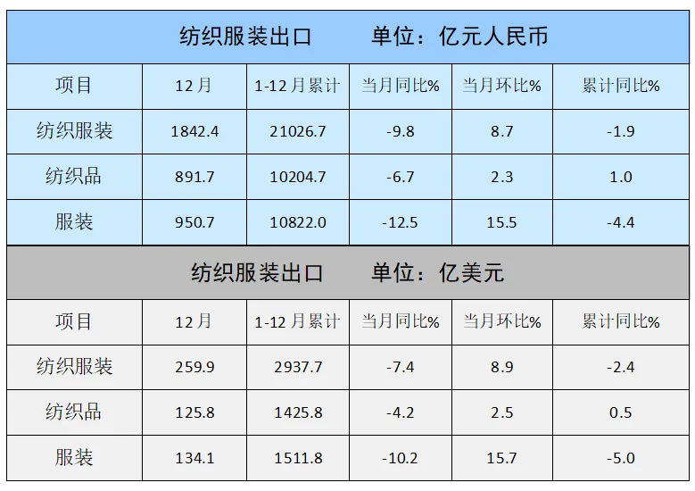 12月,纺织服装出口1842.4亿元,同比下降9.8%,环比增长8.7%,其中纺织品出口891.7亿元,下降6.7%,环比增长2.3%,服装出口950.7亿元,下降12.5%,环比增长15.5%。