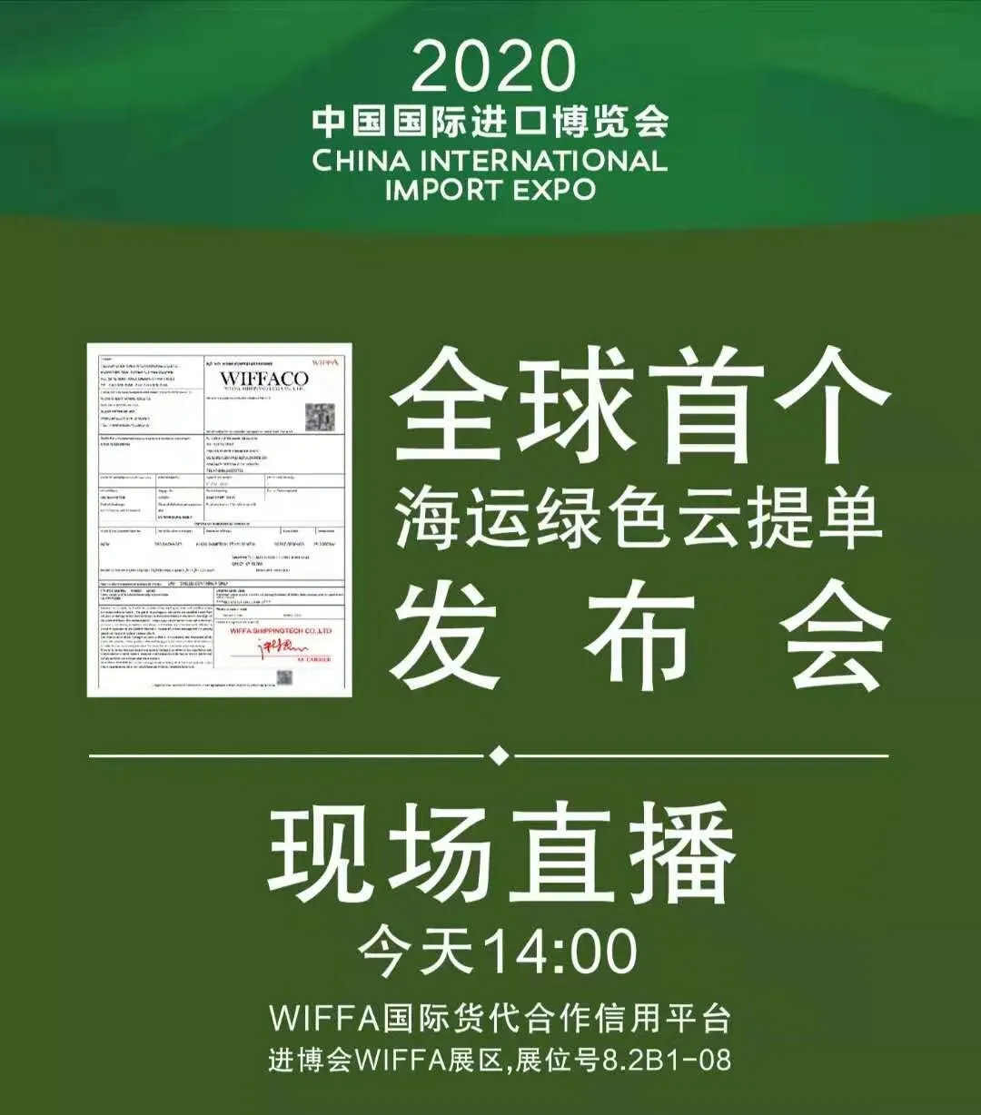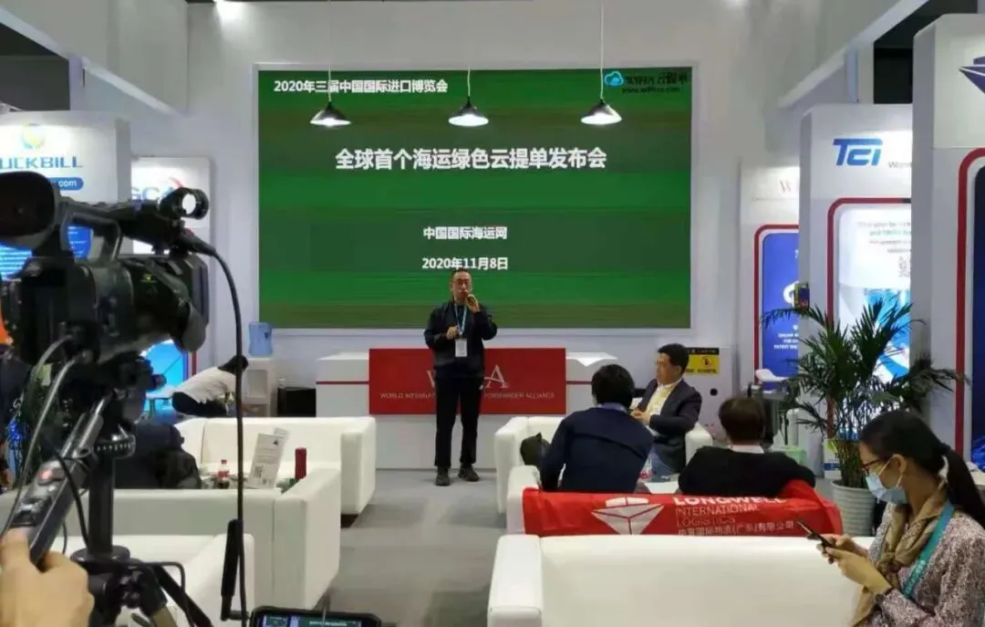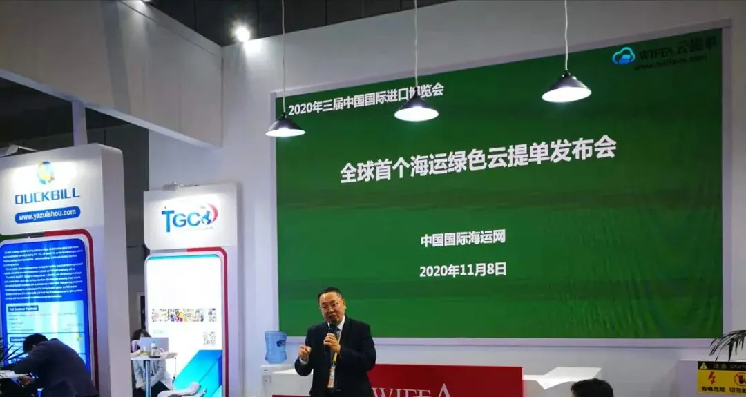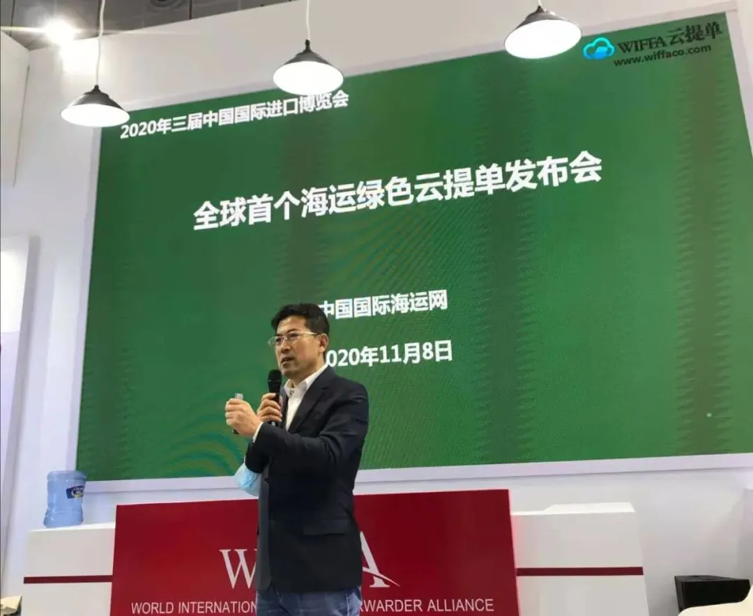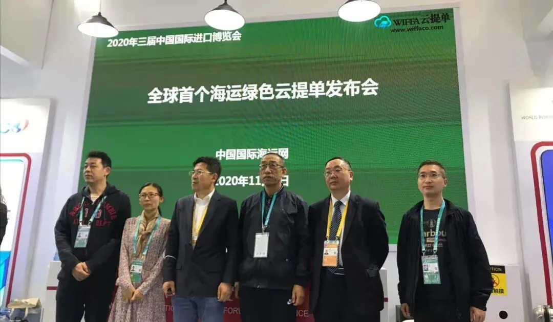 在本次进博会上,全球首个海运绿色云提单发布会现场举行,中国国际海运网总经理、WIFFA理事长康树春在大通过现场和线上直播,演示了WIFFA云单系统和WIFFA云提单专利技术以及与区块链技术相结合的七大特点:WIFFA专家咨询委员会部分成员也出席发布会,上海新景程总经理陈铮和大连海事大学世界经济研究所所长刘斌教授先后做了关于WIFFA云提单讲演。