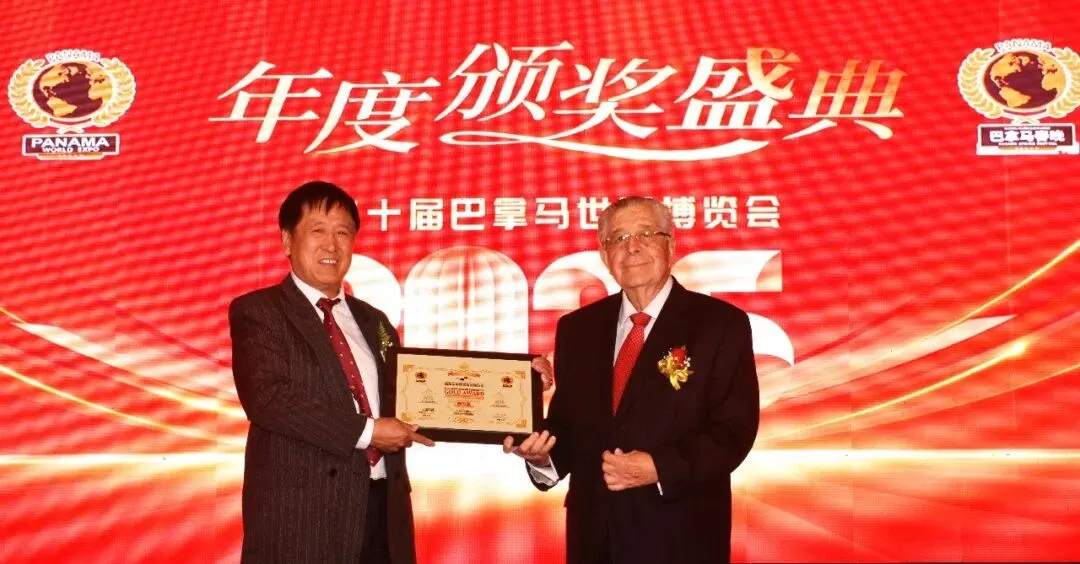 高规格、高级别、高标准品牌文化盛典-世界地标节产业联盟-2025年第二十届巴拿马世博会颁奖现场实况:颁奖嘉宾为巴拿马共和国前副总统:阿图罗·尤利西斯·瓦拉里诺·巴图亚诺(Arturo ulises vallarino batuano)先生为2025年年度金奖品牌酱中圣颁发获奖证书。
