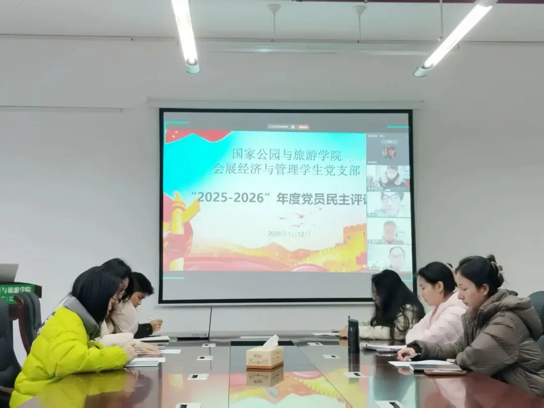 2026年1月12日上午10:00,国家公园与旅游学院会展经济与管理学生党支部在博文楼南1002室召开2025年度民主评议会。此次会议由支部书记曾桃江同志主持,支部全体党员参加。