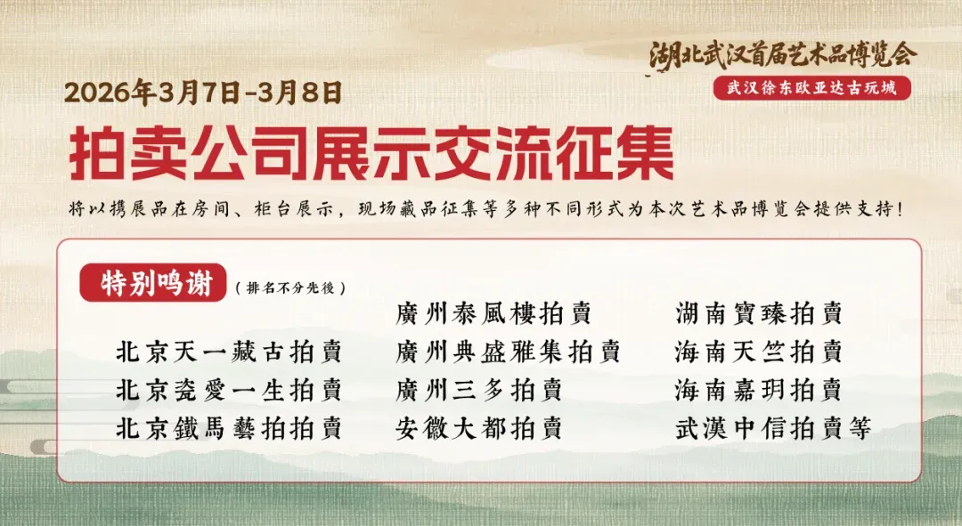 多家知名拍卖机构对本次活动给予会务支持!北京天一藏古拍卖、北京瓷爱一生拍卖、北京铁马艺拍拍卖、广州泰丰楼拍卖、广州典盛雅集拍卖、广州三多拍卖、安徽大都拍卖、湖南宝臻拍卖、海南天竺拍卖、海南嘉玥拍卖、武汉中信拍卖等拍卖公司将以携展品在房间、柜台展示,现场藏品征集等多种不同形式参与本次艺术品博览会!