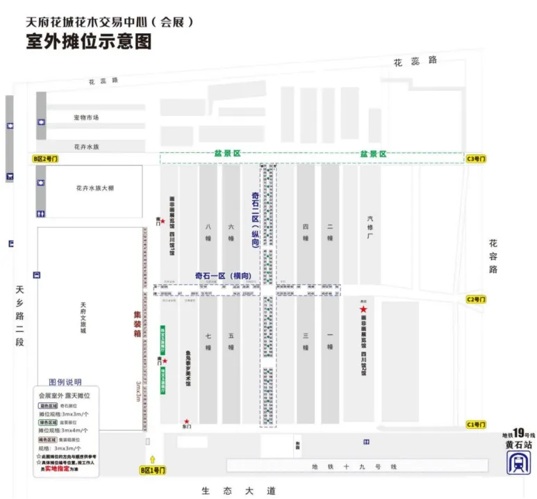 飞机:天府国际机场,双流机场乘坐地铁19号线直达黄石站,向南前行两百米到达天府花城花木交易中心。