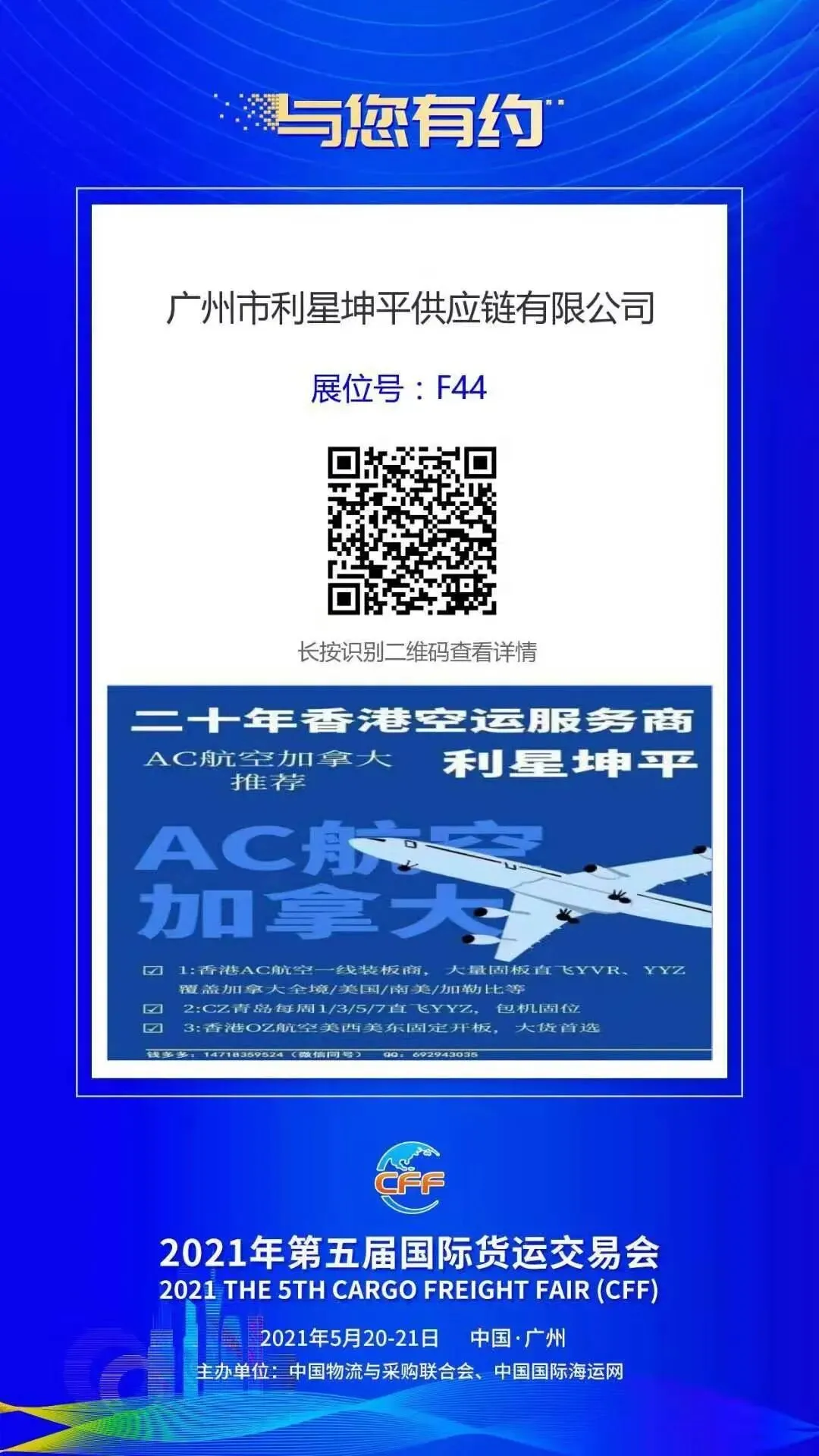 2021年第五届国际货运交易会(CFF),将于2021年5月20-21日在广州白云国际会议中心举办,CFF经过四年的成长,已经发展成货代人关注度最高,参与度最广、实效性最强的行业展洽会,立足华南市场、辐射全国,旨在为国际货运行业上下游产业提供对接合作、交易共赢、创新发展的平台。同时,助力企业拓展全球特别是一带一路国家的货运物流服务市场!展商及专业观展商涵盖国际海运、国际空运、铁路及公路运输、物流仓储园区、智慧物流信息系统、跨境电商物流、境外物流服务等,展位预计200+,线上线下高端观展团、专业观展团超万人。