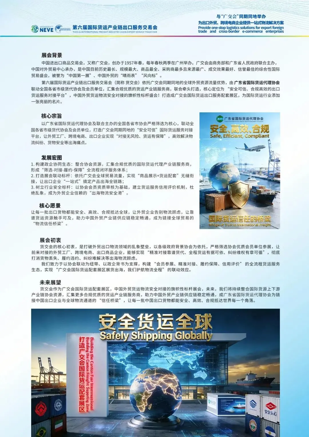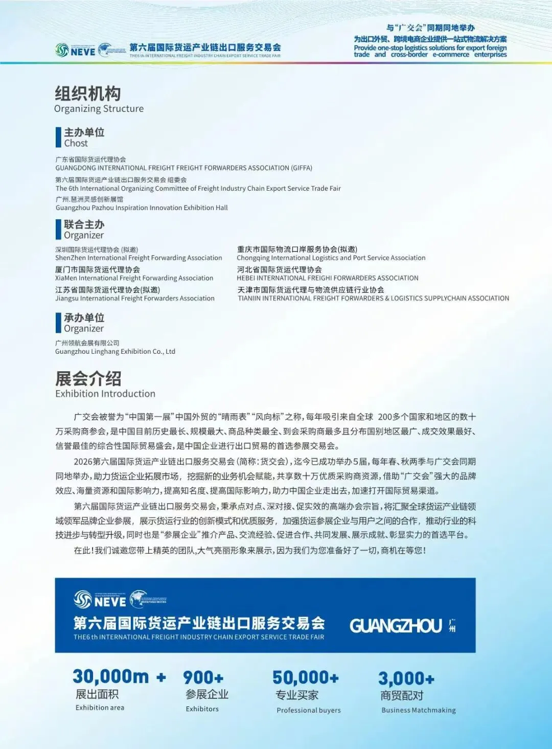 本届展会将于2026年4月14日至18日在广州琶洲•灵感创新展馆举行,并与第147届广交会同期同地举办,共享数十万国际采购商资源,打造一站式物流服务对接平台。展会具体详情如下,企业如需参展参会,可与协会联系022-23140031
