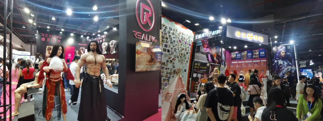 随后我和副社来到睿灵科技和金三的展位,其中睿灵科技展示的是1:1真实度的硅胶人偶,下图左应该是封神榜的纣王和妲己的形象吧,真的好想说太TM真了。另外,金三娃娃是中山的一件模具生产企业,每次展会都能见到他们的身影,金三娃娃主打的是性价比,虽然模特道具并不是真人还原,但他家的卡通娃娃也是别有一番趣味吧!