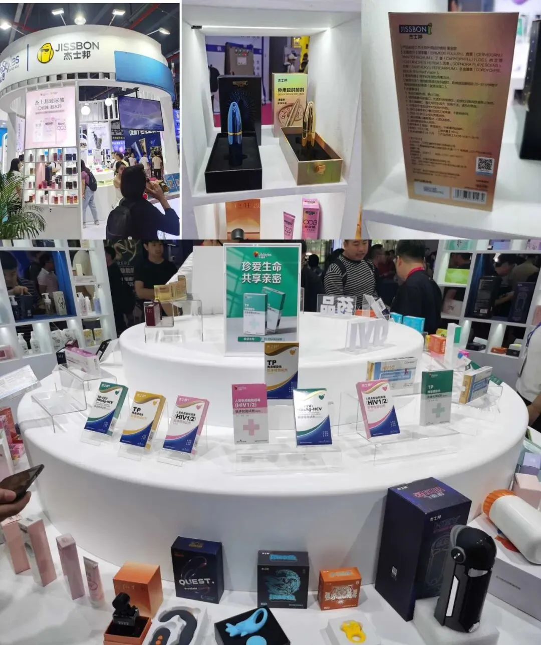 俊影展台的对面就是我们国内知名套套厂商~杰士邦了,杰士邦涉足的产品链挺多的,不仅仅有套子,还有HIV试剂、各种情趣用具以及延时喷剂,其中子弹风暴二代和三代黄金款据说在网上的销量也很不错,当然也有不少网友希望我能评测三代黄金款,不过仔细看了下配方和供应商,和安太医、白云山喷剂都是江西五麟祥代工的,源出一家,效果应该也有异曲同工之处吧。后续趣哥有组织测试黄金款的计划,大家拭目以待哈!