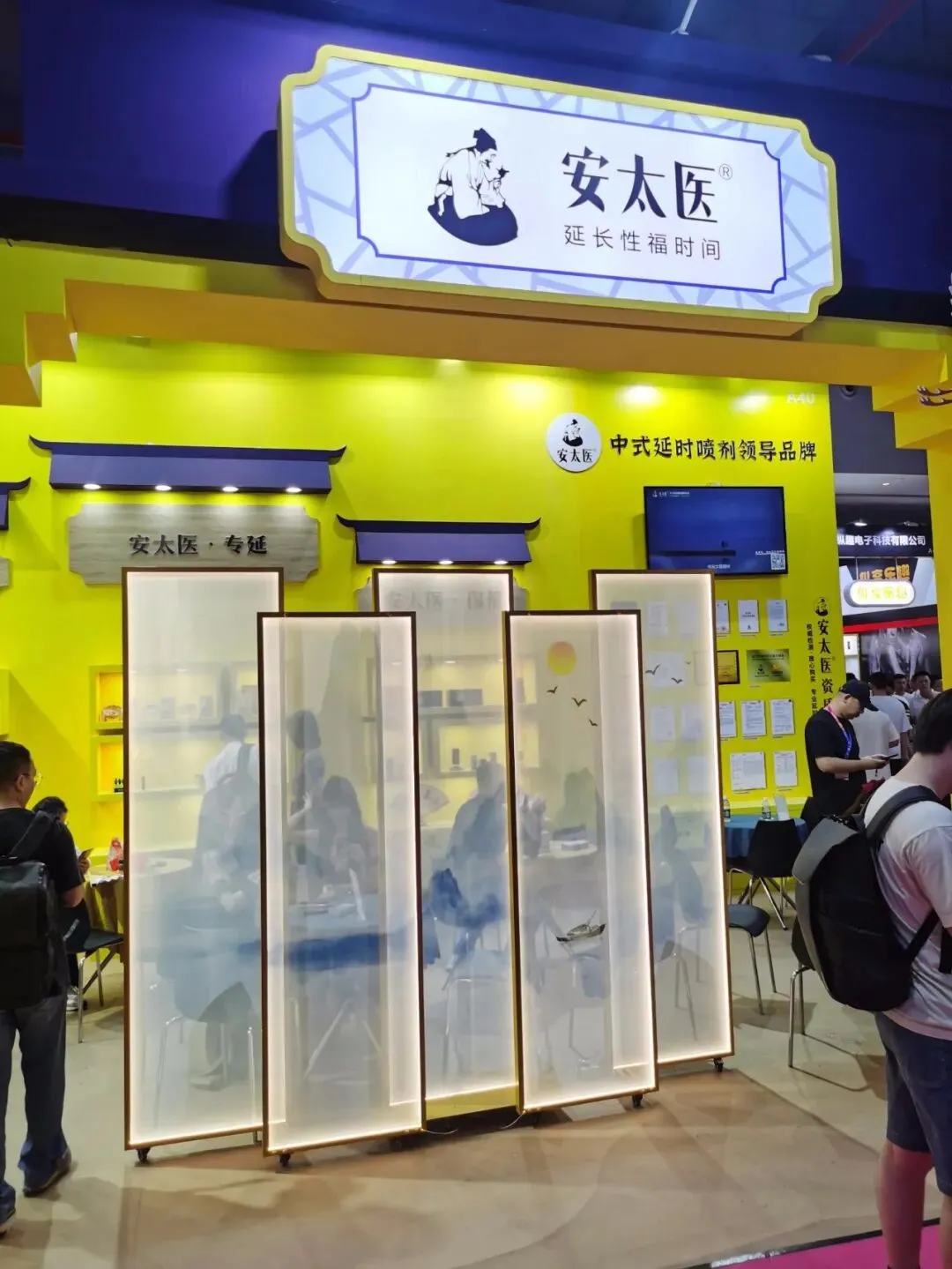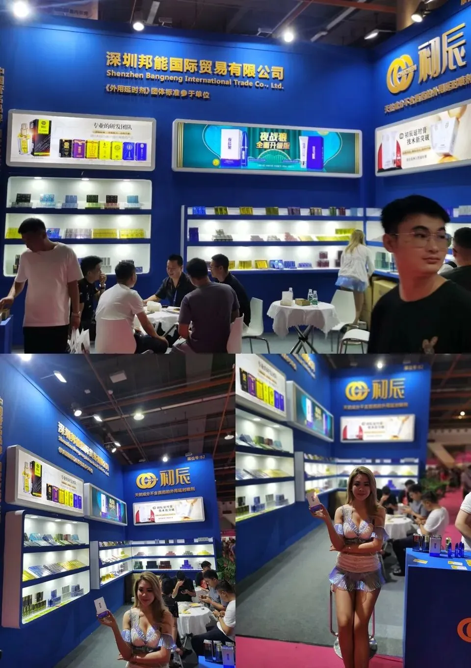 逛着逛着就来到了老朋友唐总的初辰展台,初辰也是深圳的品牌,这两年初辰系列做的也是有声有色的,比如夜战狼延时膏,效果口碑很不错,纯植物配方的,没有添加麻醉成分,体感也较为舒适!初辰旗下的其他品牌如初辰劲能液、初辰扁鹊医师等反响也还不错,属于相对温和型喷剂,主打性价比!远处唐总和客户畅聊正酣,就不去叨扰了!