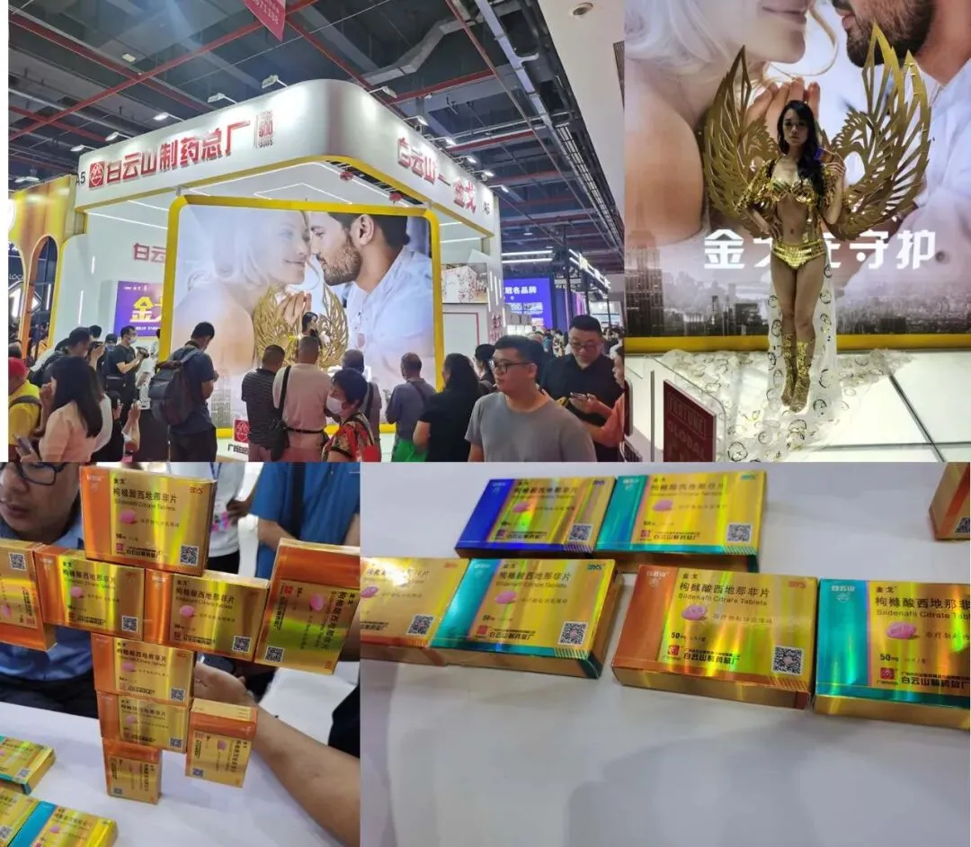 逛到了白云山药厂的展台,门口的黄金女神模特造型奇特,身材面容娇美,引得众人驻足,不过白云山主要推广的是口服西地那非和盐酸达泊西汀,经销商需要具备医疗资格才行!