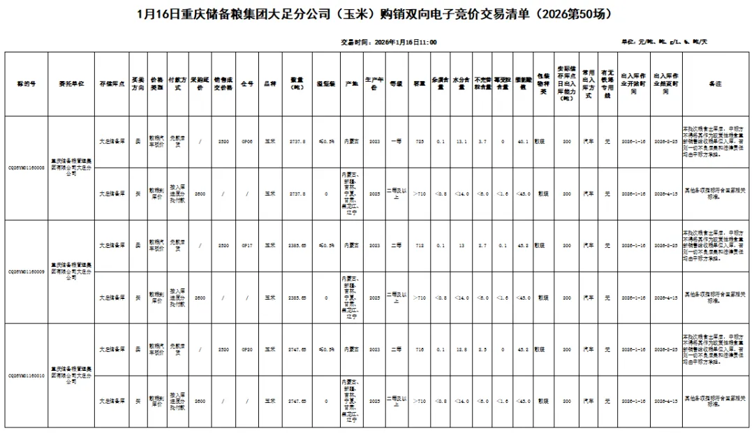 受重庆储备粮管理集团有限公司大足分公司委托,重庆市粮油批发市场有限责任公司(即国家粮食重庆交易中心,以下简称“批发市场公司”)定于2026年1月16日11:00举办重庆储备粮集团大足分公司(玉米)购销双向电子竞价交易会,现将有关事项公告如下: