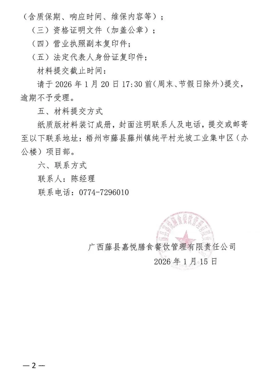 广西藤县嘉悦膳食餐饮管理有限责任公司电梯采购与安装项目市场调研公告