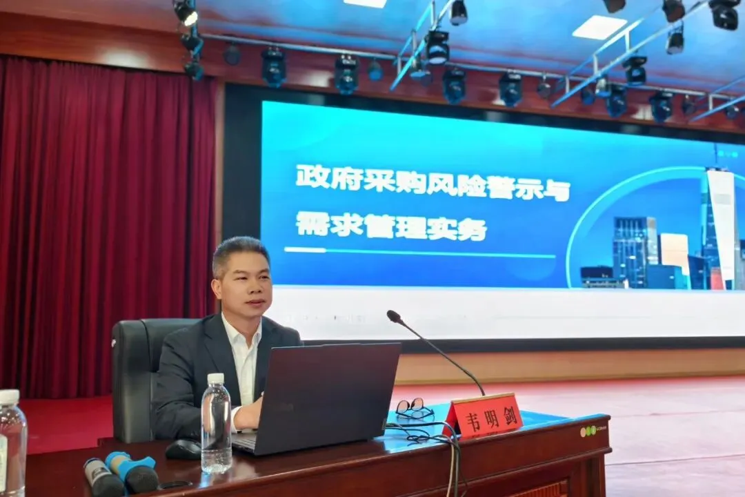 培训紧扣国务院办公厅《政府采购领域“整顿市场秩序、建设法规体系、促进产业发展”三年行动方案(2024-2026年)》的精神内核,聚焦“把好采购源头关”这一关键环节。云之龙学校校长、云之龙咨询集团副总裁、广西政府采购联合会副会长、广西财经学院特聘副教授韦明剑应邀授课,他以其深厚的政策功底与25年的实战经验,为该校教职工带来了一场兼具高度与深度的政府采购需求管理专题培训。