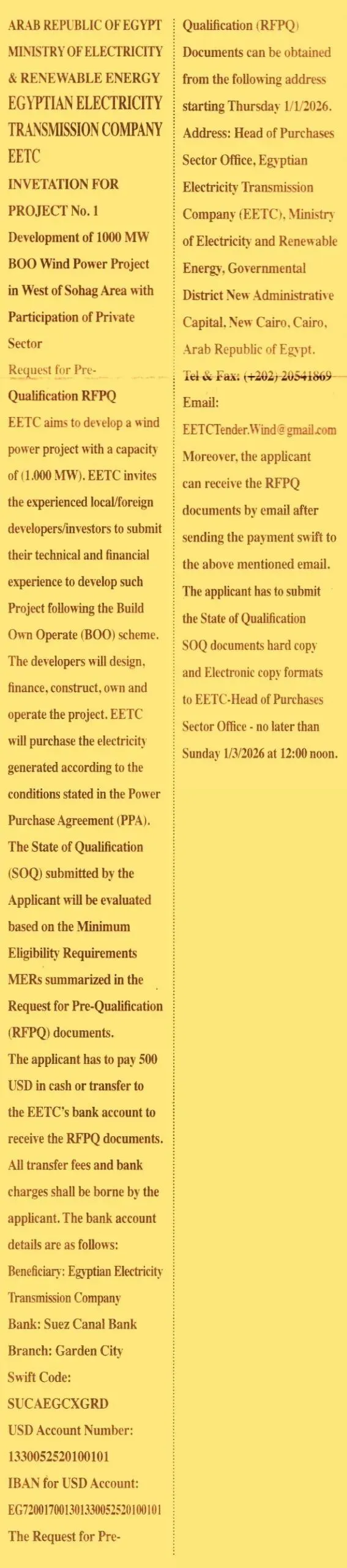 埃及电力传输公司作为项目的招标方和未来电力的购买方,现已正式开启资格预审流程。资格预审文件的获取需支付500美元费用,提交资格声明文件的截止日期为2026年3月1日。