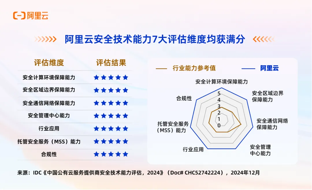 2、1月:IDC发布《中国公有云服务提供商安全技术能力评估,2024》报告,首次针对中国12家公有云服务提供商进行安全技术能力综合评测。阿里云在安全计算环境保障能力、安全区域边界保障能力、安全通信网络保障能力等7项评估维度中均获得满分。