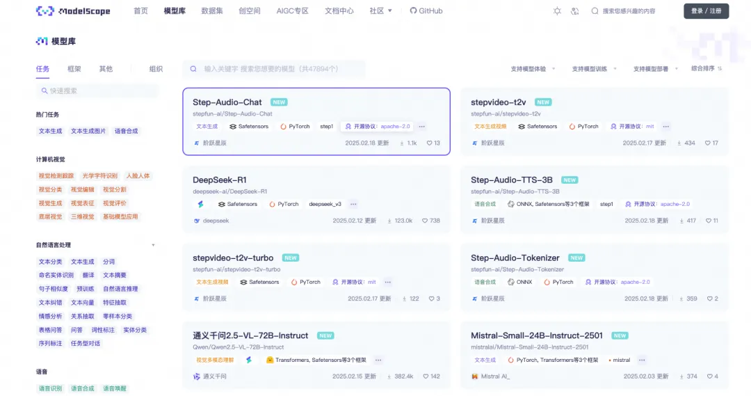 5、2月21日:在全球开发者大会(GDC)上,阿里云魔搭社区首发阶跃星辰最新开源的两款多模态模型,包括全球参数量最大的开源视频生成模型 Step-Video-T2V,以及业界首款产品级开源语音交互模型Step-Audio。截至目前,魔搭社区已上架超过4万个开源模型,涵盖LLM,对话,语音,文生图,图生视频等多个领域,是中国最大的AI模型社区。