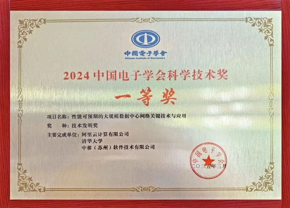 9、4月:中国电子学会正式颁发"2024中国电子学会科学技术奖",由阿里云联合清华大学,中国移动(苏州)软件技术有限公司共同申报的"性能可预期的大规模数据中心网络关键技术与应用"项目荣获中国电子学会技术发明一等奖。