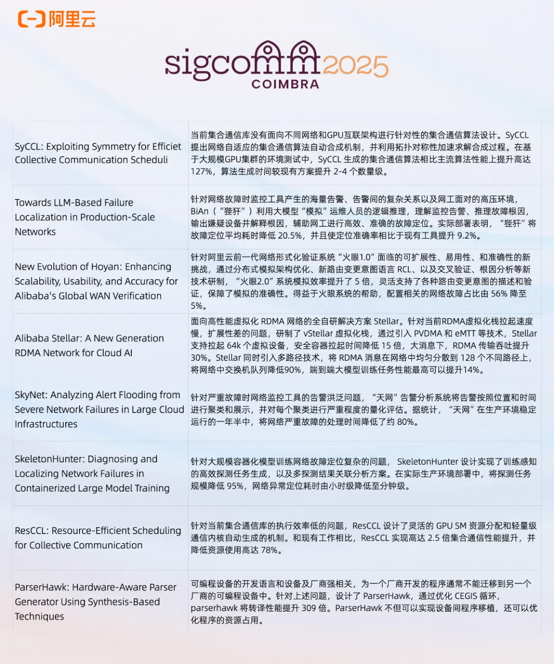 21、9月:全国网络通信领域顶级会议ACM SIGCOMM2025上,阿里云基础网络技术8篇论文被主会录用,论文研究成果涵盖基于大模型的网络根因定位、面向大模型训练的集合通信算法合成、面向智算的RDMA网络协议、网络配置流量形式化验证等多个重要领域。