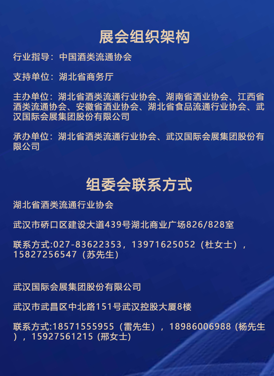 我们期待与朋友们相聚在英雄的城市武汉,共同举杯,共叙友情,分享丰盛的成果,共同打造中国中部酒业的年度盛会!