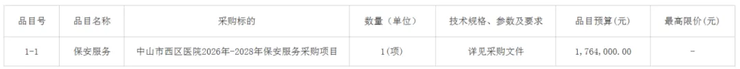 1、采购包1(中山市西区医院2026年-2028年保安服务采购项目):采购包预算金额:1,764,000.00元;