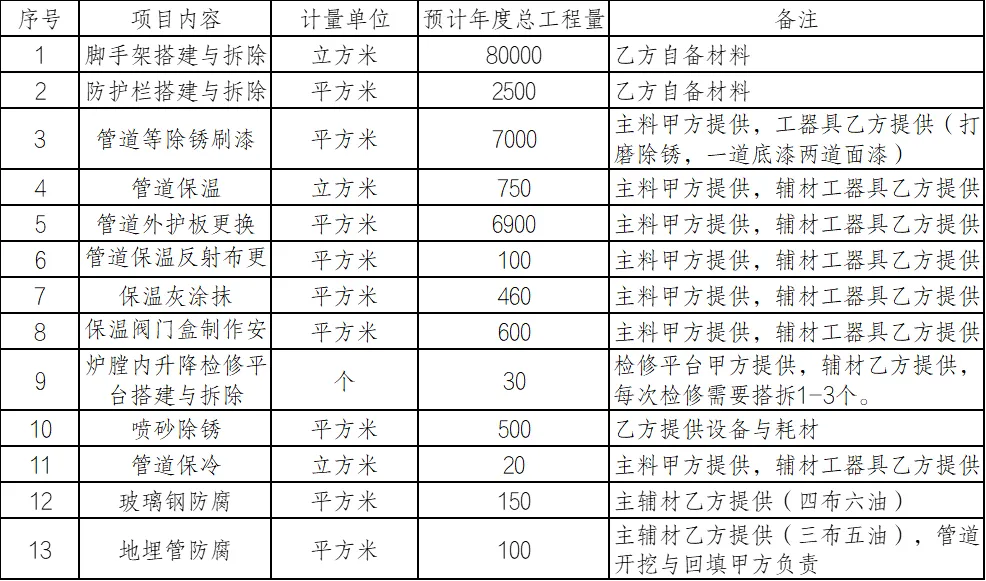 电厂因生产运维的需要,每年有大量的防腐、保温、脚手架搭拆等项目需外委,2026年度项目内容及预计工程量明细如下: