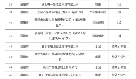 日前,湖北省生态环境厅公示2025年第二批重污染天气重点行业企业绩效评级结果,襄阳市8家企业成功入榜。其中,湖北得一新能源科技有限公司斩获A级绩效评级;东风汽车纳米科技(襄阳)有限公司、襄阳市鸿琰实业有限责任公司(肖湾纸箱生产)、嘉施利(宜城)化肥有限公司(磷化工绿色循环产业厂区)获评B级绩效评级;葛洲坝临港宜城建材有限公司、湖北省襄阳市荣昇和新型建材科技有限公司、襄阳市泰基混凝土有限公司、襄阳兴恒达新型建材科技有限公司则获得绩效引领性评级。