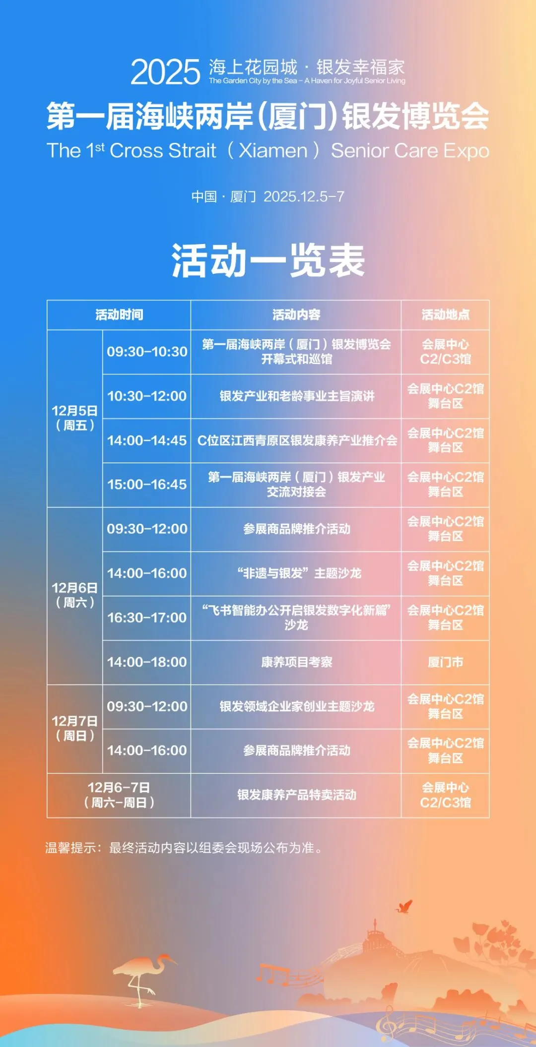 这场以“海上花园城·银发幸福家”为主题的行业盛会,由厦门建发国旅集团和厦门报业传媒集团联合主办。展会通过展示前沿适老成果、创新银发服务模式、深化两岸产业协作,为海峡两岸银发经济发展注入新动能。
