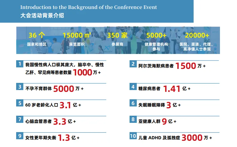 疫情后时代,中国乃至全球功能医学市场规模飞跃式增长。作为从根本上防愈的功能医学,从肠道功能、免疫与慢性炎症、解毒与生物转化、内分泌与激素、线粒体能量氧化还原、循环运输、结构性等失衡多个领域,通过从分子和基因水平,对个体全面系统评估、分析身体不适,评估细胞、器官功能状况,进行失衡纠偏预防,解决患者长期和根本性的问题。与此同时,随着世界人口健康预期寿命越来越长,各国长寿科技的持续研发投入,更多创新性技术已从实验室逐渐走向临床,包括细胞重编辑,衰老细胞清除 Senolytics,基因疗法,再生医学, AI 辅助诊断抗衰老异常等多项突破性技术进入了更多人体试验阶段,长寿健康管理由被动治疗到主动预防逆转。作为亚太区规模最大、专业性最强的功能医学盛会,CFMC 已成功举办七届,累计吸引 350+ 头部企业参展、25000+ 医院、渠道、代理、高净值买家参与。国际长寿科技创新大会也在此基础上延伸,进一步展示全球长寿科技前沿技术和运营的创新模式。 2026 年,CFMC 全面升级: •15000 ㎡ 展区,覆盖 8 大核心领域,精准对接临床需求; •5000+ 健康管理机构、1000+ 私立三甲医院、20000+ 专业买家定向邀约; •36 个国家展团联动,打造全球化资源对接平台。参展即抢占行业制高点,与全球顶尖专家、决策者共谋未来!