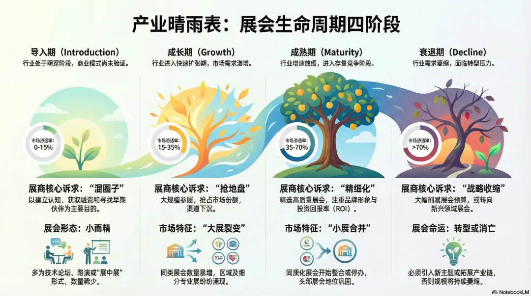 运用创新扩散理论分析展商行为,我们可以发现企业在行业不同发展阶段的参展策略存在显著差异:此阶段企业的核心诉求是建立行业认知、获取融资、寻找早期合作伙伴。主要活动形式包括:参加行业论坛和学术研讨会以获取技术前沿信息;出席 投资路 演活动争取资本青睐;参与各类行业沙龙 " 混圈子 " 建立人脉;在综合性展会的相关展区小规模亮相试探市场反应。此阶段展商身份往往是 " 参会者 " 而非 " 参展商 " ,以学习和社交为主要目的。随着产品成熟和市场扩大,企业开始大规模参展以抢占市场份额。主要行为特征包括:积极抢占头部展会的黄金展位;同时参加多个区域性展会进行渠道下沉;尝试举办自办会或经销商大会强化品牌影响力;重视新品发布会的策划和传播效果;开始重视展会 ROI (投资回报率)的量化评估。此阶段企业的展会预算和人员投入达到峰值。当行业进入成熟期,展商行为趋于理性和精细化。主要表现为:精选少数高质量展会集中资源打造品牌形象;从追求展位面积转向注重展示效果和客户体验;更加重视老客户维护和 复购 转化 ,甚至自主举办渠道会议和发布会 ;开始关注海外市场,参加国际性展会拓展出口渠道;探索数字化展会工具 提升获客效率 。行业衰退期的展商呈现两极分化:头部企业维持必要的品牌曝光,但大幅削减展会预算;中小企业则逐步退出展会市场,转向更具成本效益的线上营销渠道 ,小型精准对接会 ;具有转型能力的企业将资源转移至新兴领域展会。如何准确判断行业所处的发展阶段,进而预测展会市场的演变趋势?以下指标体系可供参考:根据创新扩散原理,渗透率是核心的判别依据。渗透率低于 15% 通常对应导入期, 15%-35% 对应成长期, 35%-70% 对应成熟期,超过 70% 则进入衰退期。对于 B2B 行业,可用产能利用率、头部企业 市占率等 替代指标进行推算。导入期同类 展会仅 数 个 ,一般是敢于投资的先行者 ,成长期快速增至 5-10 个甚至更多 ,区域市场开始遍地开花 ,成熟期开始整合减少 ( 1-3 万平米做不大的会被整合或者消失) ,衰退期仅存 全国和区域性少量 头部展会。单个展会的展商数量变化曲线与行业生命周期高度吻合 —— 导入期缓慢增长,成长期快速攀升,成熟期波动趋稳,衰退期持续下滑。导入 期观众 以技术人员、投资者、媒体为主,专业度高但规模小;成长期经销商、采购 商比例 快速上升,观众规模激增;成熟期终端用户占比提高,展会可能向 B2B2C 模式转型;衰退 期专业 观众流失,展会吸引力下降。导入期以论坛、路演、技术发布为主;成长期新品发布会、招商会、渠道对接会密集;成熟期客户答谢会、行业颁奖典礼、标准发布会增多;衰退期活动规模和频次全面缩减。导入期展区边界模糊,通常与相关行业混合;成长期细分展区不断分化,新技术专区涌现;成熟期展区格局稳定,但开始出现跨界融合区域;衰退 期传统 展区萎缩,替代技术展区扩张。展会市场的 " 大展裂变 " 与 " 小展合并 " 并非随机现象,而是市场力量作用的必然结果。- 第一,行业细分化程度加深,产业链上下游诉求差异化,综合性展会难以满足所有参与者的精准需求,催生专业化子展会;