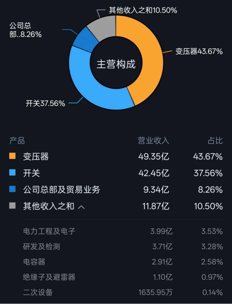 中国西电的主营业务聚焦输配电及控制设备全产业链,是国内该领域的 “国家队” 龙头企业,变压器(43.67%)是公司的第一大收入来源,覆盖 110kV 到 1000kV 全电压等级,特高压变压器技术国际领先,参与国内 80% 以上特高压项目(如白鹤滩、陇东 - 山东特高压工程),市占率稳居行业前列。开关(37.56%)第二大核心业务,特高压 GIS(气体绝缘开关设备)市占率超 40%,是国内独家研制抽蓄电站成套开关的厂家,产品广泛应用于水电、核电、特高压等大型能源项目。覆盖 40.5~1100kV 组合电器、断路器等,技术成熟度高,部分产品实现国产化替代。其他业务(占比约 20%)。