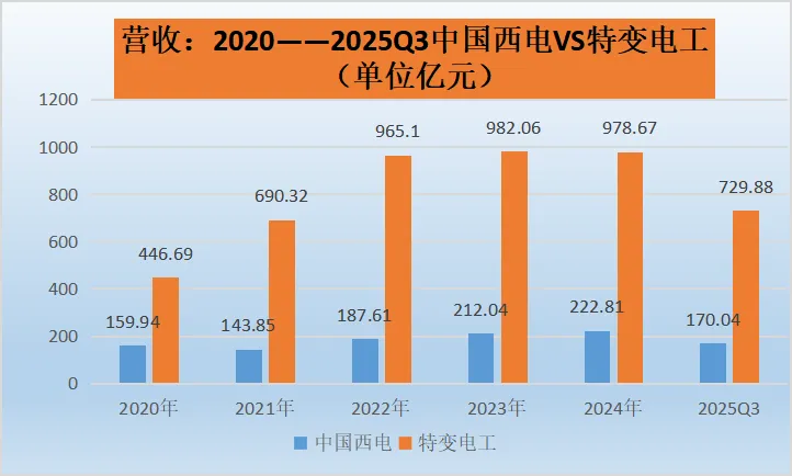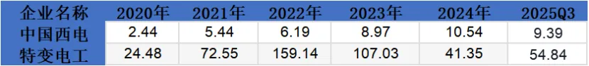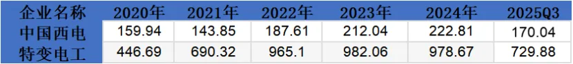 特变电工营收规模远超中国西电:在2020 - 2025Q3期间,特变电工各年度的营业收入均显著高于中国西电。例如2020年,特变电工营收为446.69亿元,而中国西电仅为159.94亿元,特变电工营收规模大约是中国西电的2.8倍。到2024年,这一差距依然明显,特变电工营收978.67亿元,中国西电为222.81亿元,特变电工营收规模约为中国西电的4.4倍。这表明特变电工在整体业务体量上具有较大优势。
