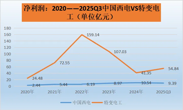 特变电工净利润规模大幅领先:在2020 - 2025Q3期间,特变电工各年度的净利润均远高于中国西电。2020年,特变电工净利润为24.48亿,而中国西电仅为2.44亿,特变电工净利润约是中国西电的10倍。到2022年,差距进一步拉大,特变电工净利润达到159.14亿,中国西电为6.19亿,特变电工净利润约是中国西电的25.7倍。虽然2024年差距有所缩小,但特变电工41.35亿的净利润仍远高于中国西电的10.54亿。这充分显示出特变电工在盈利能力上具有显著优势。