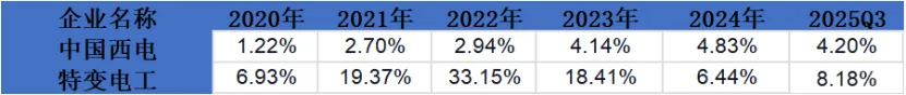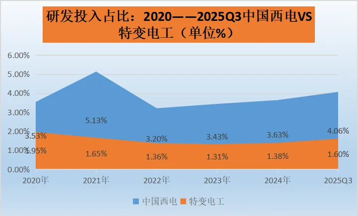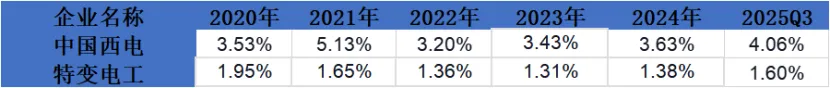 中国西电研发投入占比高于特变电工:在2020 - 2025年第三季度期间,中国西电各年度的研发投入占比均高于特变电工。例如2020年,中国西电研发投入占比为3.53%,而特变电工仅为1.95%,中国西电比特变电工高1.58个百分点。到2024年,中国西电研发投入占比为3.63%,特变电工为1.38%,差距依然明显。这表明中国西电在研发创新方面相对更为重视,投入力度更大。