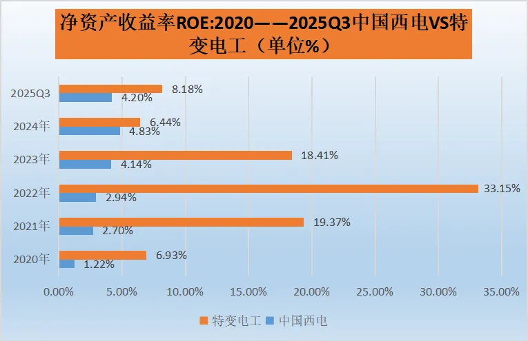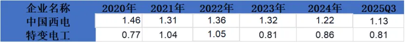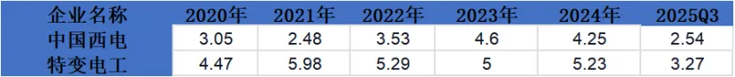 特变电工净资产收益率显著高于中国西电:在2020 - 2025年第三季度期间,特变电工各年度的净资产收益率均远高于中国西电。例如2020年,特变电工净资产收益率为6.93%,而中国西电仅为1.22%,特变电工约是中国西电的5.68倍。到2022年,差距进一步拉大,特变电工达到33.15%,中国西电为2.94%,特变电工约是中国西电的11.28倍。这表明特变电工在资产利用效率和盈利能力方面明显强于中国西电。
