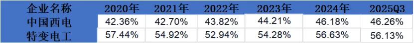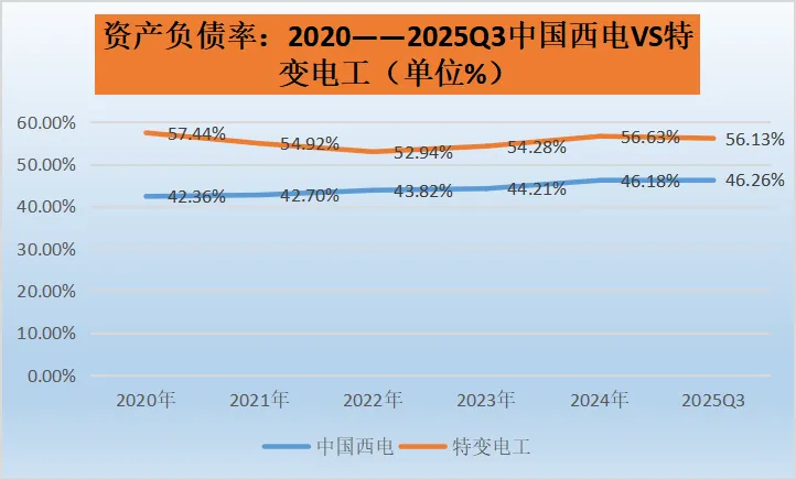 趋势变化方面中国西电呈缓慢上升趋势:2020 - 2024年,中国西电的资产负债率从42.36%逐步上升至46.18%,2025年第三季度为46.26%,基本保持稳定且略有上升。这可能意味着公司在逐步扩大业务规模的过程中,适度增加了负债融资,但整体资产负债率仍处于相对合理且稳健的水平,财务风险相对可控。