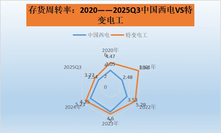 中国西电存货周转率低于特变电工:在2020 - 2025年第三季度期间,中国西电各年度的存货周转率均低于特变电工。例如2020年,中国西电存货周转率为3.05,而特变电工为4.47,中国西电比特变电工低1.42。到2024年,中国西电存货周转率为4.25,特变电工为5.23,差距依然存在。这表明特变电工在存货管理效率和销售能力方面相对较强,能够更快速地将存货转化为销售收入;而中国西电在存货周转方面相对较弱,可能存在存货积压或销售速度较慢的问题。