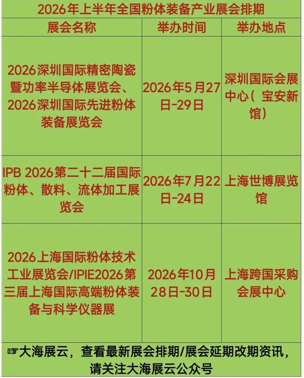 2026年上半年全国粉体装备产业展会排期