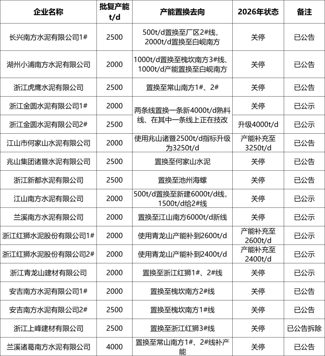 根据2025年度浙江省工信部门发布的产能置换清单,结合浙江省水泥生产线数据,2025年度浙江省关停13条熟料线,其中12条2000t/d—2500t/d熟料线,1条4000t/d熟料线。