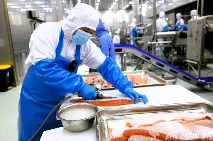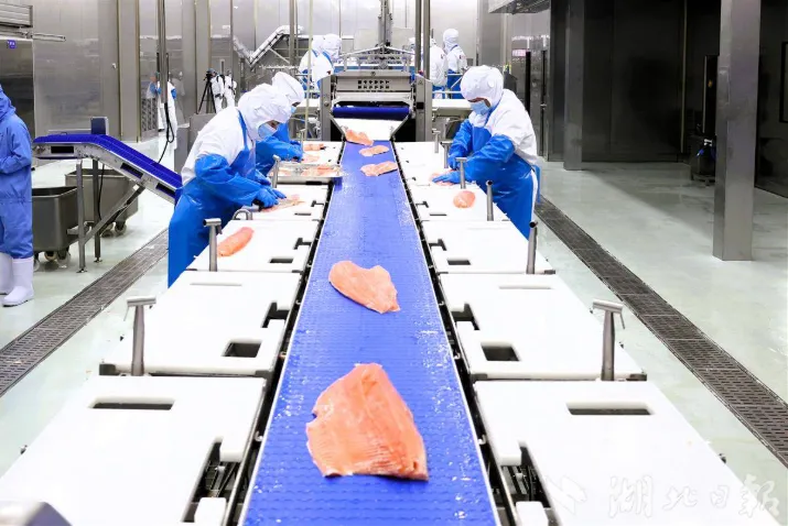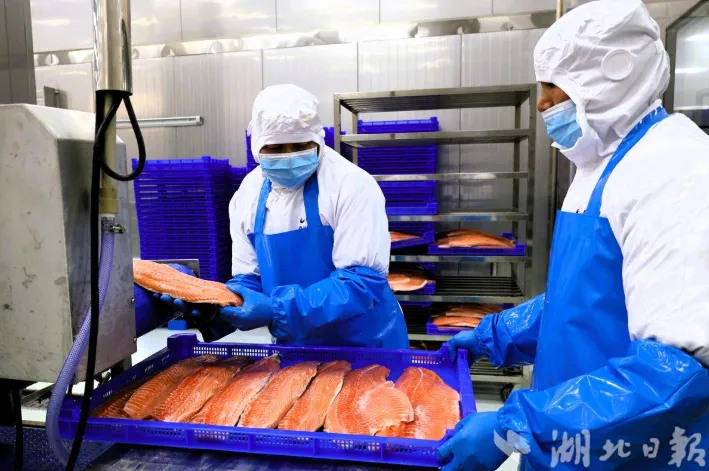亚洲最大智能三文鱼生产线投产 三文鱼从北欧“飞”上百姓餐桌的时间压缩至36小时。湖北日报全媒记者周鹏摄