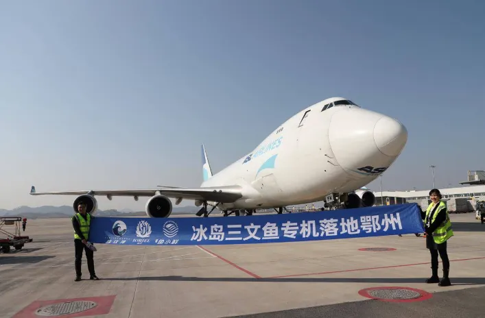 1月14日下午1时58分,冰岛三文鱼专机落地鄂州。湖北日报通讯员王星予摄