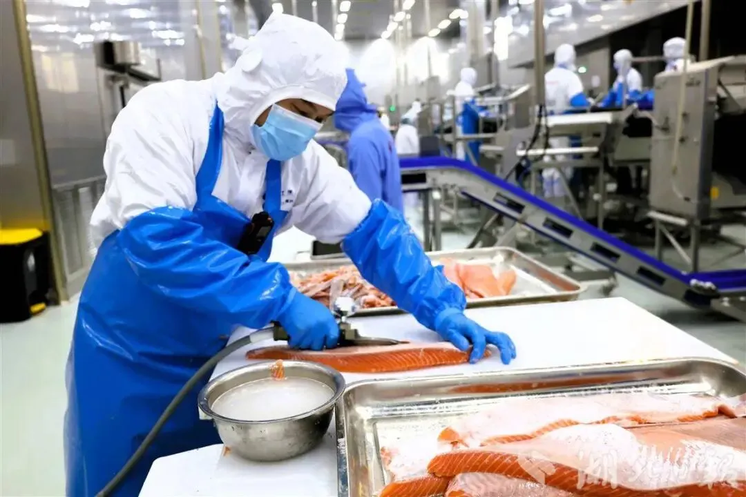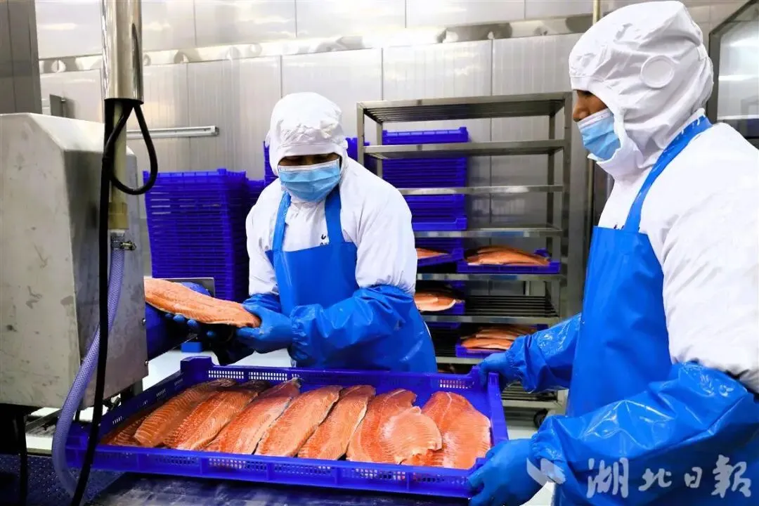 亚洲最大智能三文鱼生产线投产 三文鱼从北欧“飞”上百姓餐桌的时间压缩至36小时。(湖北日报全媒记者 周鹏 摄)