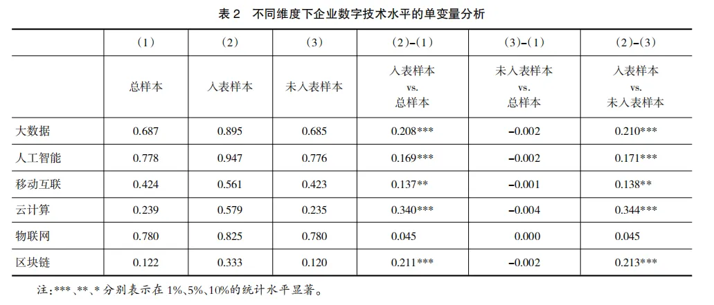 数据资产并非凭空出现,而是数字化转型的产物。大量组织进行数字化转型后,将过往历史、实践经验、理论知识等信息数字化,形成了可分析、可复制、可利用的数据。经采集、清洗、开发后形成数据资源,当这些数据资源满足资产认定标准后,即确认为数据资产。目前入表上市公司多数是自行开发数据资源,因此,数据资产的入表取决于企业数据治理水平,有意愿、有能力对数据进行实质性加工是自行开发数据的企业进行数据资产入表的前置条件。基于金星晔等[5 ]的数据,本文统计了入表样本公司数字化转型情况,并将其与非入表公司进行了对比(如表2 所示)。可以看出,入表样本公司在大数据、人工智能、移动互联、云计算和区块链等方面的数字技术水平显著高于非入表样本,说明数字化转型水平与数据资产入表行为密切相关。