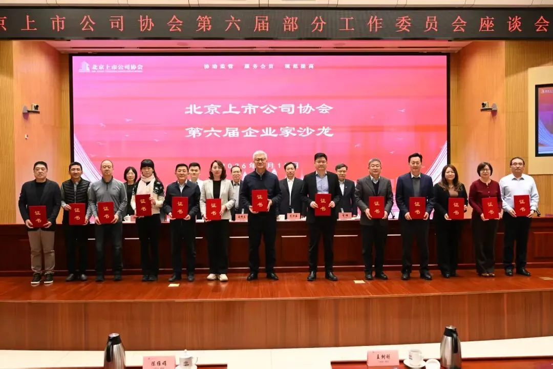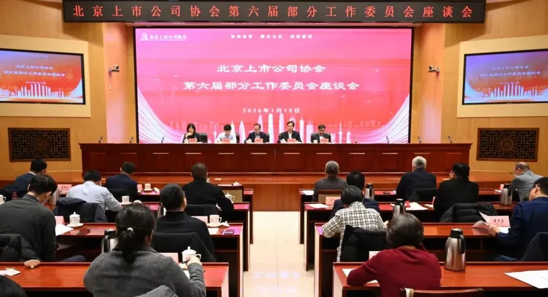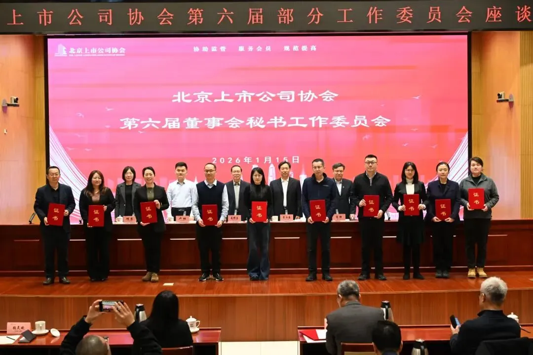 2026年1月15日,北京上市公司协会(以下简称“协会”)在理事单位中国铁建大厦组织召开第六届部分工作委员会工作交流座谈会。北京证监局公司监管一处相关同志、协会理事长姜修昌出席会议;协会副秘书长、企业家沙龙主任、中国国航董事会秘书兼总会计师肖烽,协会副秘书长、董事会秘书工作委员会主任、中国铁建董事会秘书靖菁参加会议。座谈会由协会秘书长李洪海主持,企业家沙龙、董事会秘书工作委员会、境外上市公司工作委员会和协会秘书处人员积极参会并开展交流。 在主会场上,李洪海秘书长报告了协会基本情况及第六届部分工作委员会的组建、调整背景与结果,并向新聘任的工作委员会成员颁发聘任证书。