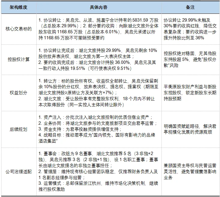 君亭酒店本次控股权变更是“民营中高端酒店龙头+省属文旅国资”的优势互补案例,核心价值体现在,产业协同明确:湖北文旅的入主精准解决君亭发展瓶颈——一方面,湖北省内丰富的文旅资源(景区、城市综合体)为君亭提供新增量;另一方面,国资背景的资金与增信支持,可助力君亭突破民营资本的融资限制,加速全国化扩张。从行业视角看,本次交易也反映出中高端酒店行业的发展趋势:头部民营酒店集团在规模化扩张中面临资源与资金约束,而地方国资正积极通过控股上市公司切入消费服务领域,“民营运营能力+国资资源”的合作模式或将成为行业整合的重要方向。未来,随着湖北文旅资产注入、文商旅协同落地,君亭酒店有望突破区域限制,从“浙江龙头”成长为全国性中高端酒店集团。